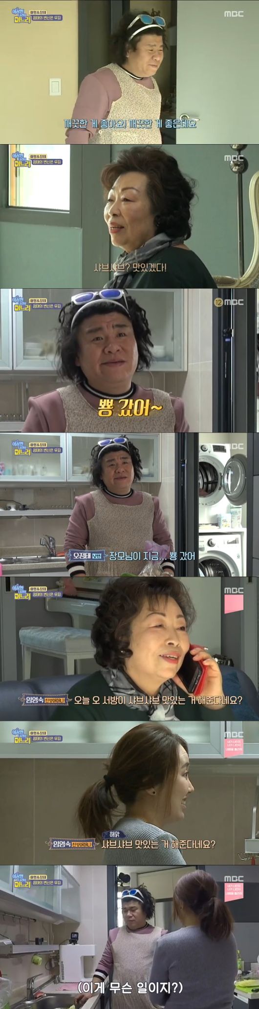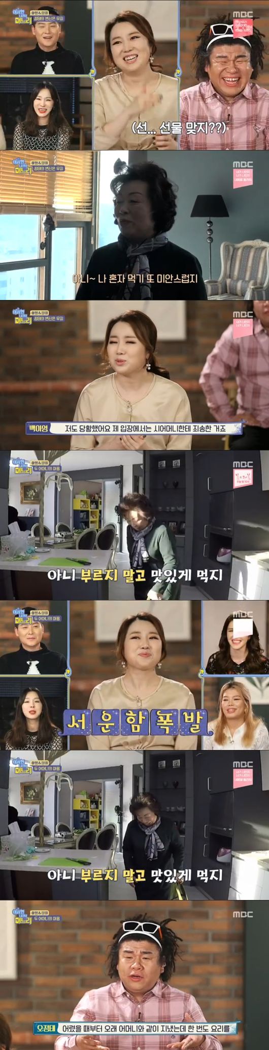 아영과 정태의 입장은 갑자기 난감해졌다. 집안일 하는 정태 모습을 제일 싫어하는 정태母기에 두 사람은 걱정했다. 친정母는 "혼자만 먹기 미안해서 그렇다"꼬 하자, 정태는 "장모님만 해드리려 했다"고 했다.