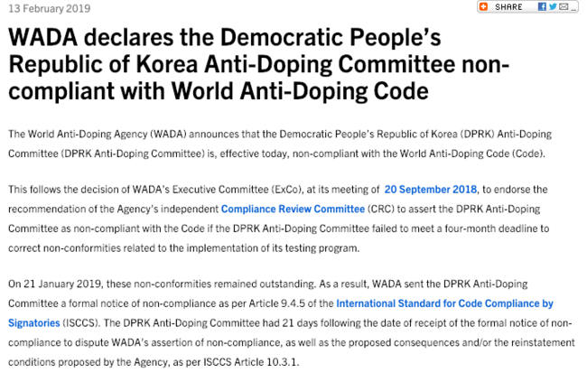 WADA는 14일(한국시간) 북한의 도핑방지위원회를 반도핑 비준수 단체로 지정, 이를 발표했다. WADA는 지난해 9월 20일 북한도핑방지위원회에 "4개월 내에 위반 활동을 시정하라"고 통보했지만 이를 준수하지 않았다. 결국 WADA는 지난달 21일 관련 내용을 북한 측에 통보했다.