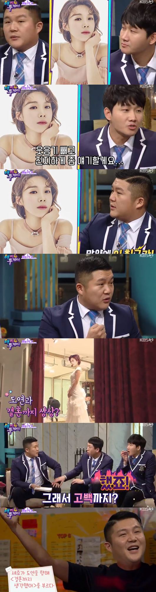 양세찬은 "노래방에 세호 창희 나래 도연이 있었다. 조세호가 노래를 부르다가 무릎을 꿇고 그리고 나서 스카프와 꽃을 선물하면서 고백했다. 도연이가 거절해서 세호 형이 민망해서 스카프로 봉산탈춤을 췄다"고 전했다.