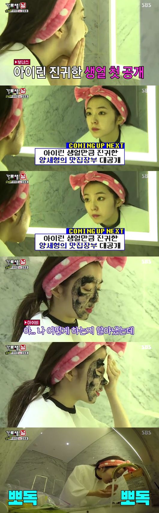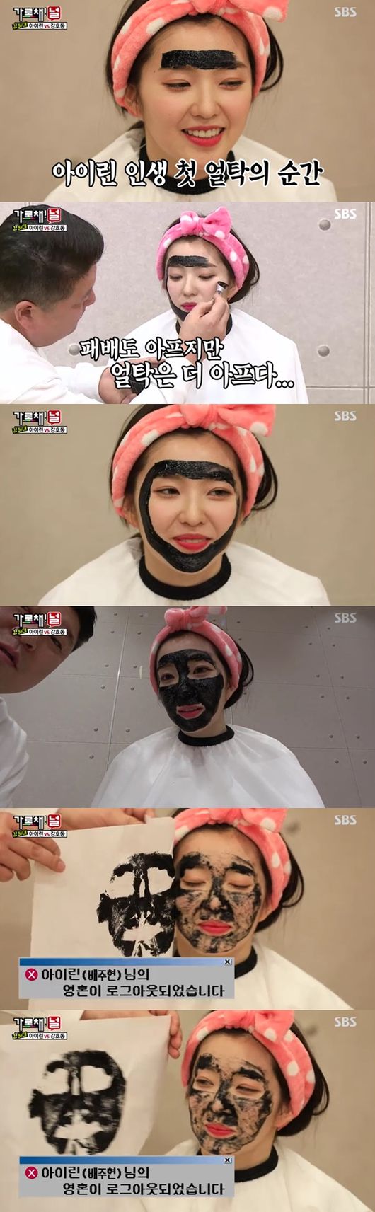 다음은 강호동이 도전을 외쳤다. 가볍게 컵반 던지기 대결에서 승리, 벌칙단이 바로 입장했다. 아이린은 그 자리에서 바로 '얼탁' 벌칙을 받게 됐다. 그럼에도 굴욕없는 미모로 시선을 강탈, 민낯을 첫 공개했음에도 화장 전후와 차이 없는 아이린의 美친미모가 또 한번 주목을 사로 잡았다. 강호동은 "한번 더 도전해라"고 제안, 아이린이 또 다시 "도전"을 외쳐 흥미로움을 안겼다.