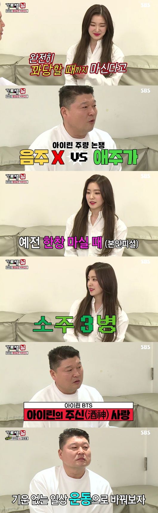 이어 소주광고를 찍은 아이린이 애주가인지 질문 "한창 마실 때는 소주 세 병까지 마셨다"고 말해 깜짝 놀라게 했다. 아이린은 "요즘은 그렇게도 못 마신다"고 덧붙였다. 이어 운동녀인지 질문, 아이린은 "기운업슨 일상을 운동으로 바꿔보자 생각했다"면서 다양한 운동들을 섭렵했다고 했다. 강호동은 "나보다 잘하는 운동이 있냐"고 묻자, 아이린은 윗몸 일으키기를 꼽았다. 이어 100개 넘게 하냐는 말에 "쪼깨 한다"며 당황한 듯 사투리를 꺼내 웃음을 안겼다. 이어 윗몸 일으키기로 강호동에게 승리를 거뒀다.
