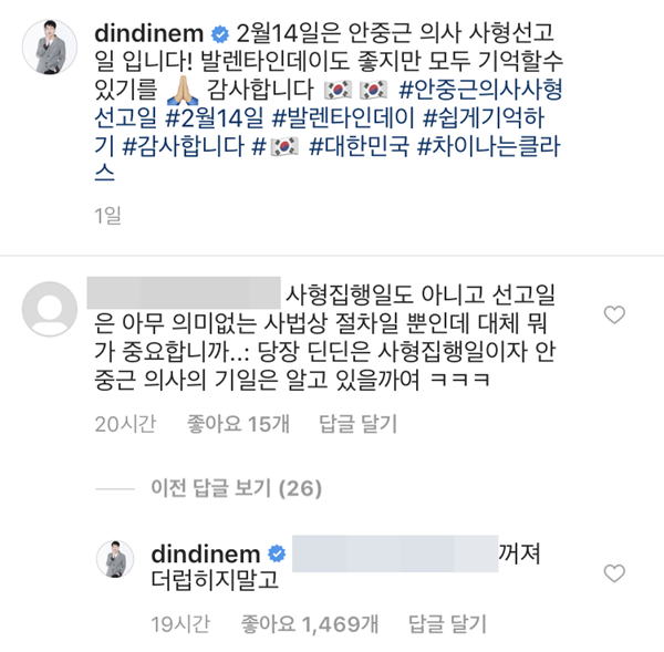 한 네티즌은 해당 게시글에 "사형 집행일도 아니고 선고일은 아무 의미 없는 사법상 절차일 뿐인데 대체 뭐가 중요합니까. 당장 딘딘은 사형집행일이자 안중근 의사의 기일은 알고 있을까요"라는 댓글을 달았다.