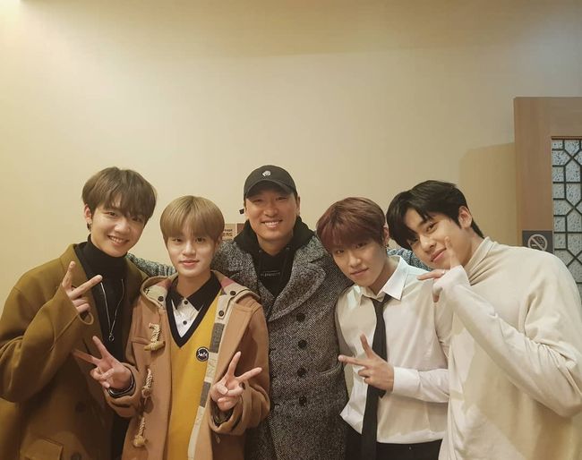 공개된 사진에는 라이머와 브랜뉴보이즈 임영민, 이대휘, 박우진, 김동현은 브이자를 그리고 있는 모습이 담겨 있다.