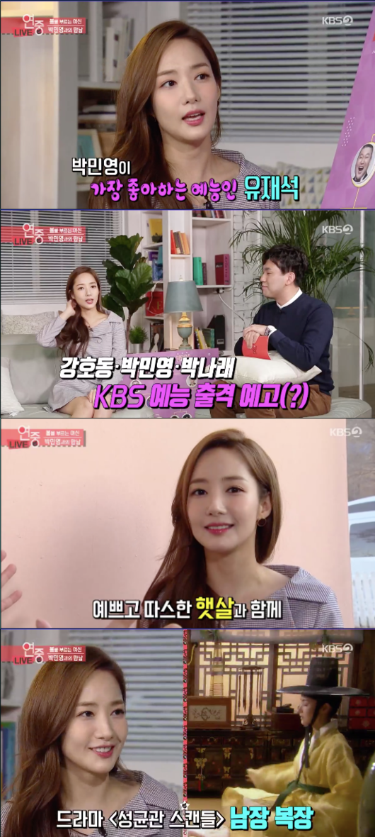 이어 유재석, 신동엽이 후보였다. 박민영은 “유재석 선배님은 가장 좋아하는 예능인이다. 하지만 같이 했으니 신동엽 선배님을 꼽겠다”고 털어놨다.