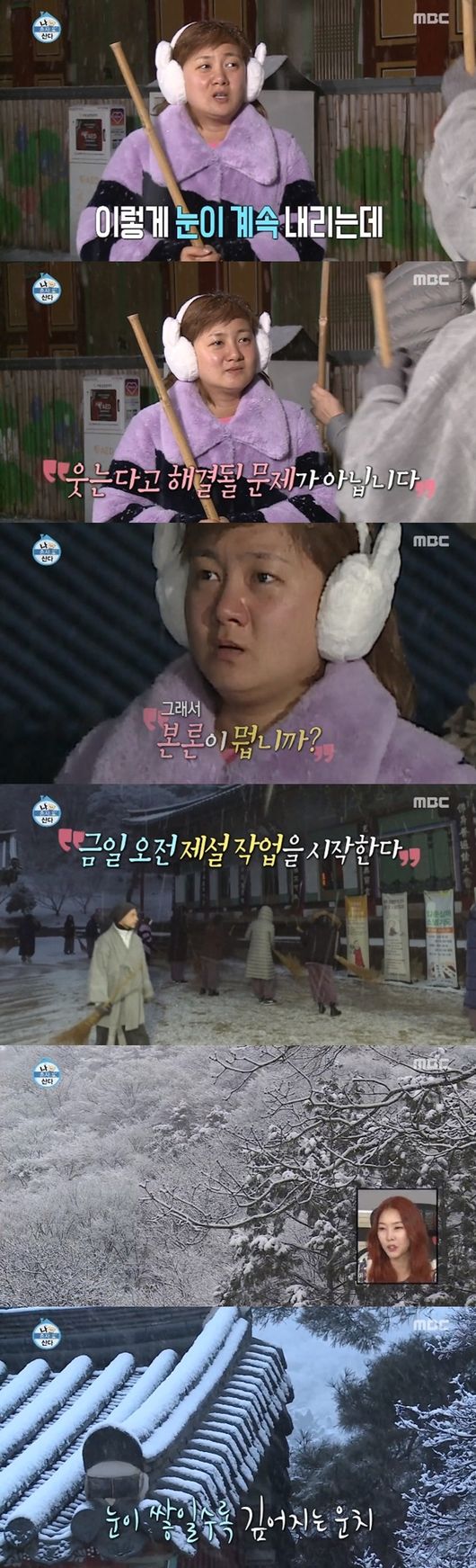 개그우먼 박나래가 템플스테이를 떠났다. 그러나 힐링은 잠시, 갑작스러운 눈으로 제설작업에 나서게 됐다.