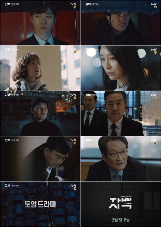 그런가 하면 ‘자백’을 이끌 명품 배우들이 모두 등장해 이목을 집중시킨다. 먼저 예리한 눈빛의 문성근(추명근 역)은 등장만으로도 묵직한 존재감을 더한다. 이어 정희태(서팀장 역), 송영창(오회장 역), 윤경호(허재만 역)등 연기파 배우들의 모습이 빠르게 이어져 기대감을 고조시킨다. 또한 미스터리한 분위기의 남기애(진여사 역), 의구심을 품은 눈빛의 신현빈(하유리 역)이 차례로 등장해 궁금증을 높인다. 끝으로 비 내리는 밤, 이준호(최도현 역)와 유재명이 나란히 서 있는 모습은 보는 이의 시선을 강렬하게 사로잡는다.