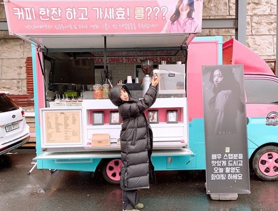 사진 속 박신혜는 한효주가 선물한 커피차 앞에서 귀여운 포즈를 취하고 있다. 현수막에는 '박신혜 배우와 임승용 대표님, 그리고 영화 '콜' 전 스태프를 응원합니다'라는 응원 글이 적혀 있다.