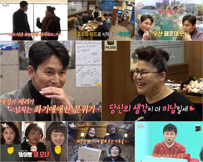 음식이 나오자 정우성은 ‘먹교수’ 이영자의 리드 아래 ‘먹바타’로 변신, 그녀의 손짓 하나하나를 주시했다. 이에 이영자는 손수 그와 그의 매니저의 밥을 비벼주는 등 알뜰살뜰하게 챙겨 훈훈함을 자아냈다. 이에 ‘먹바타’ 샛별로 떠오른 정우성은 음식을 먹고 폭풍 리액션을 선보이는가 하면 자신의 맛집을 소개하는 등 명품 예능감을 제대로 뽐냈다.