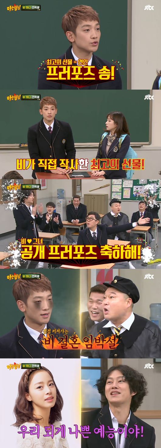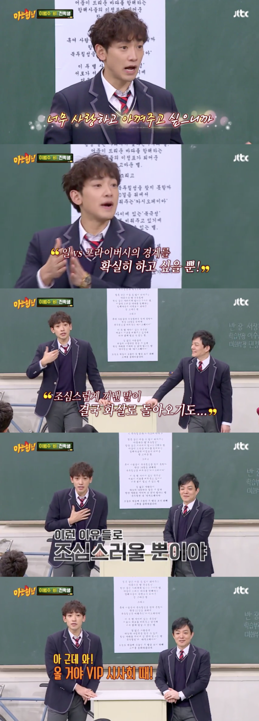지난 16일 방송된 JTBC ‘아는 형님’에는 비와 이범수가 형님 학교의 전학생으로 출연했다. 비의 ‘아는 형님’ 출연은 이번이 두 번째. 앞서 김태희와의 결혼 발표 전 출연했다.