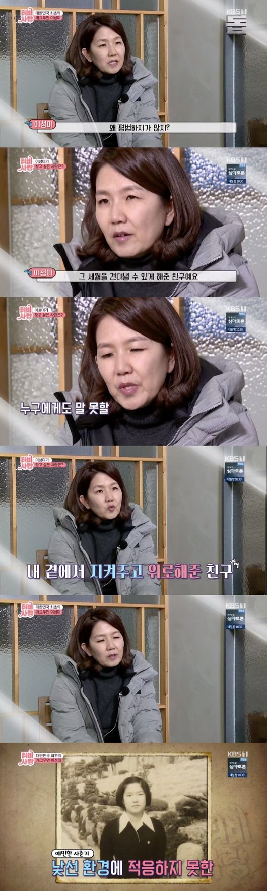 이후 아버지는 세 번째 여자를 만나 또 한 번의 결혼생활을 시작했다고. 이성미는 친엄마를 제외하고 두 명의 새엄마가 있었던 것. 이성미는 “(두 번째 새엄마가)제게 잘해주셨지만 제가 겉돌았다. 말 한마디를 쉽게 하실 수 있는데 내가 고깝게 들었다. 난 부적응자였다”고 고백했다.