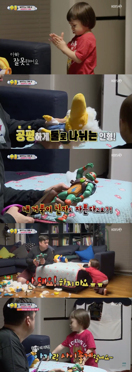 샘 해밍턴은 “이제 말로 안 되겠다. 연년생이다 보니까 장난감 때문에 싸움이 안 날 수 없다. 공평하게 이 전쟁을 막아보겠다”며 인형을 가위로 잘랐다. 반으로 잘린 인형을 본 윌리엄은 “아가랑 사이 좋게 하겠다”며 벤틀리랑 같이 갖고 놀겠다고 약속했다. 양보하지 않으면 둘 다 손해라는 중요성을 깨닫게 하는 샘 해밍턴의 눈높이 교육이었다.