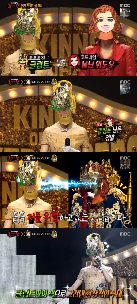 17일 방송되는 MBC '미스터리 음악쇼-복면가왕(이하 복면가왕)'에서는 클림트가 불난 위도우를 꺾고 가왕 자리에 오르는 모습이 그려졌다.