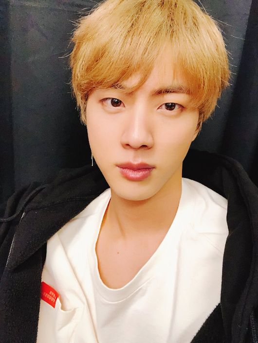 진은 17일 오후 방탄소년단 공식 트위터에 “일본 투어 안녕”이라는 메시지와 함께 셀카 사진 2장을 올렸다. 사진에서 진은 빛나는 금발머리와 조각 같은 외모를 자랑하고 있다.