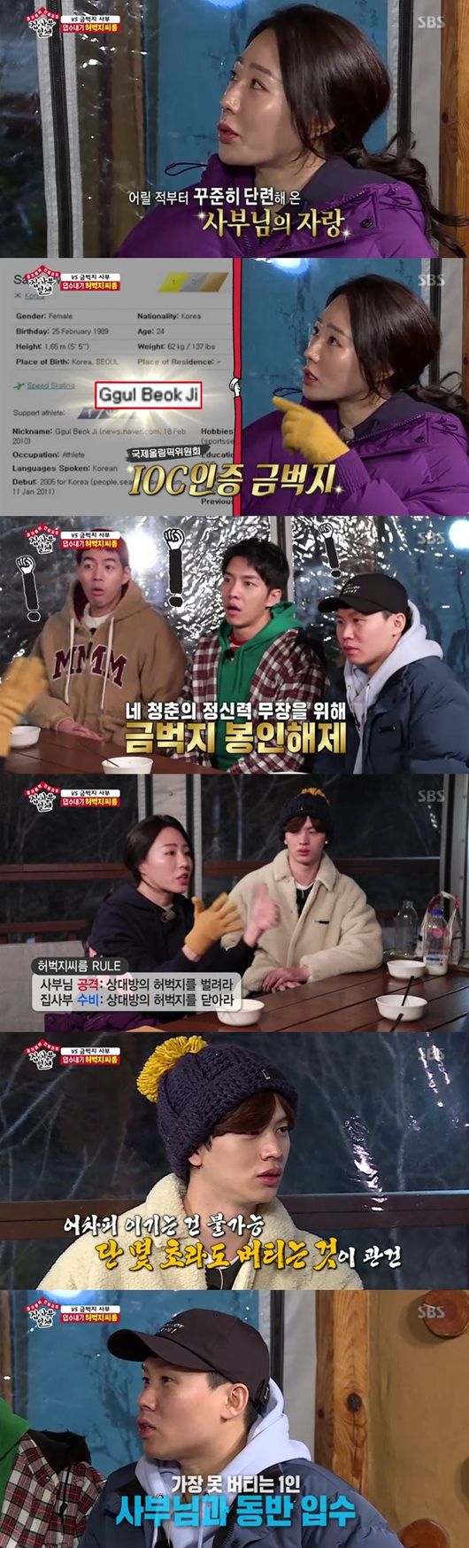 이상화 선수는 "정신력이 강해야한다는 걸 느꼈다"면서 정신력을 무장을 위한 태릉 전퉁 훈련법으로 한겨울 얼음물 입수를 언급했다. 입수자 선정게임으로 이상화 선수는 허벅지 씨름을 제안했다. 국보급 금벅지라 불리는 이상화 선수는 "단 한번도 허벅지 씨름을 해본 적 없다"면서 처음 시도해본다고 했다. 가장 못 버티는 사람이 입수하기로 했다. 먼저 양세형부터 이상화가 대결을 펼쳤다. 이상화선수는 "저는 그냥 이기겠다"며 역시 자신감 넘치는 모습으로 나왔다. 양세형은 예상보다 5.5초를 기록, 기대하지 못한 선전에 이상화 선수는 당황했다. 다음은 육성재였다. 시작하는과 동시에 바로 패배, 1.64초기록했다. 육성재는 스스로 "하체 쓰레기인가보다"고 말해 웃음을 안겼다. 이어 이승기가 도전, 특전사 출신답게 비장한 모습을 보였고, 4.71초를 기록했다. 이상화 선수도 "강하다"며 인정했다. 마지막 주자인 이상윤이 도전, 이상화 선수는 "가장 세다"며 센스있게 대결을 중단했고, 1.64초는 거뜬히 넘겼다. 이를 본 성재는 "사부님 힘 빠졌을 때 다시 도전하겠다"고 했으나, 0.74라는 신기록을 또 다시 갱신해 웃음을 안겼다.