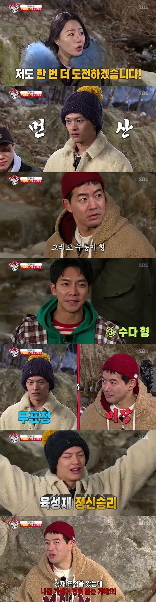 육성재는 발은 물론 얼음물 세수까지 선보이며 상남자 모습을 보였다. 이때, 이상화 선수가 올림픽 때 착용한 고글 사인 선물이 걸리게 됐다. 이에 이승기와 이상윤, 그리고 양세형까지 즉석에서 이상화 선수의 보물이 걸린 급 대결을 펼쳤다. 전원 입수한 가운데, 모두 포커페이스를 유지했다. 하지만 자신만만했던 이승기와 양세형이 중도 포기, 이 와중에도 육성재와 이상윤은 미동도 없었다. 돌부저처럼 대결을 펼치던 두 사람, 하지만 이내 이상윤이 포기하고 말았다. 육성재는 "사부님이 말한, '생각이 좌우한다'는 말을 믿었다"면서 정신력으로 승부했다고 했다. 모두 "이런 것이 포커페이스 심리전, 역시 정신력이다"고 감탄했다.