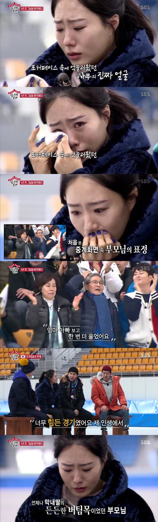 1년 전 그때의 떨림이 느껴졌다. 전국민이 다 본 영상이지만 1년전 영상과 처음 직면하는 이상화 선수는, 어느새 웃음기도 싹 사라졌다. 이상화 선수는 "아무생각 안 들린다, 난 할수 있단 생각 뿐이었다"면서 회상, 드디어 마지막 구간의 영상이 나왔다. 드디어 직면하게된 첫 실수, 이상화 선수는 "여기서 고개를 못 들겠더라"면서 4년동안 기다렸던 올림픽이 끝냈단 생각에 고개를 못 들었던 당시를 전했다. 처음 본 중계화면 속 부모님의 표정을 보곤 결국 눈물을 흐리고 말았다. 이상화 선수는 "진짜 힘들었다 이때"라고 말하며 부모님 얼굴에 꾹꾹 눌러왔던 눈물이 터지고 말았다. 든든한 버팀목이었던 부모님, 이상화 선수는 "돌 때 부모님 보고 한 번 더 울었다"고 했다. 상상할 수 없는 그날의 감정들이 파노라마처럼 스치는 듯, 부모님 얼굴과 함께 수많은 감정들이 엉켜 눈물을 멈추지 못했다. 포커페이스 속 눌러웠던 진짜 사부의 얼굴이었다.