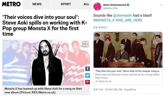 빌보드 뿐만이 아니다. 영국의 유력 매체 '메트로'도 몬스타엑스를 극찬했다. 메트로는 지난 15일(현지시각) 자사 홈페이지를 통해 "'그들의 목소리가 네 영혼에 스며든다': 스티브 아오키가 K팝 그룹 몬스타엑스와 처음으로 함께한 작업에 대해 밝혔다"(‘Their voices dive into your soul: Steve Aoki spills on working with K-Pop group Monsta X for the first time)를 제목으로 기사를 게재했다.