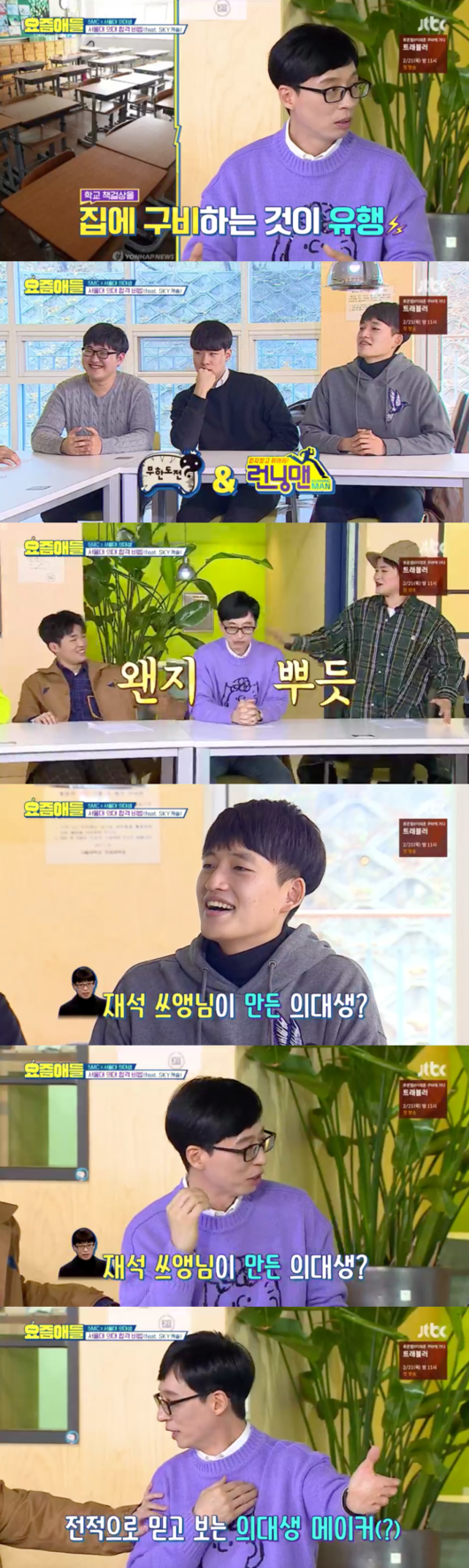 17일 전파를 탄 JTBC ‘요즘애들’ 10화에서 유재석, 김신영, 안정환, 김하온, 황광희는 서울대 의대생들을 만났다. 인기리에 종영한 드라마 ’SKY캐슬’에서 캐슬 주민들은 서울 의대 합격에 목숨을 걸었던 바. ‘요즘애들’ 멤버들은 실제 서울 의대생들을 만나 궁금증을 모두 풀자고 했다.
