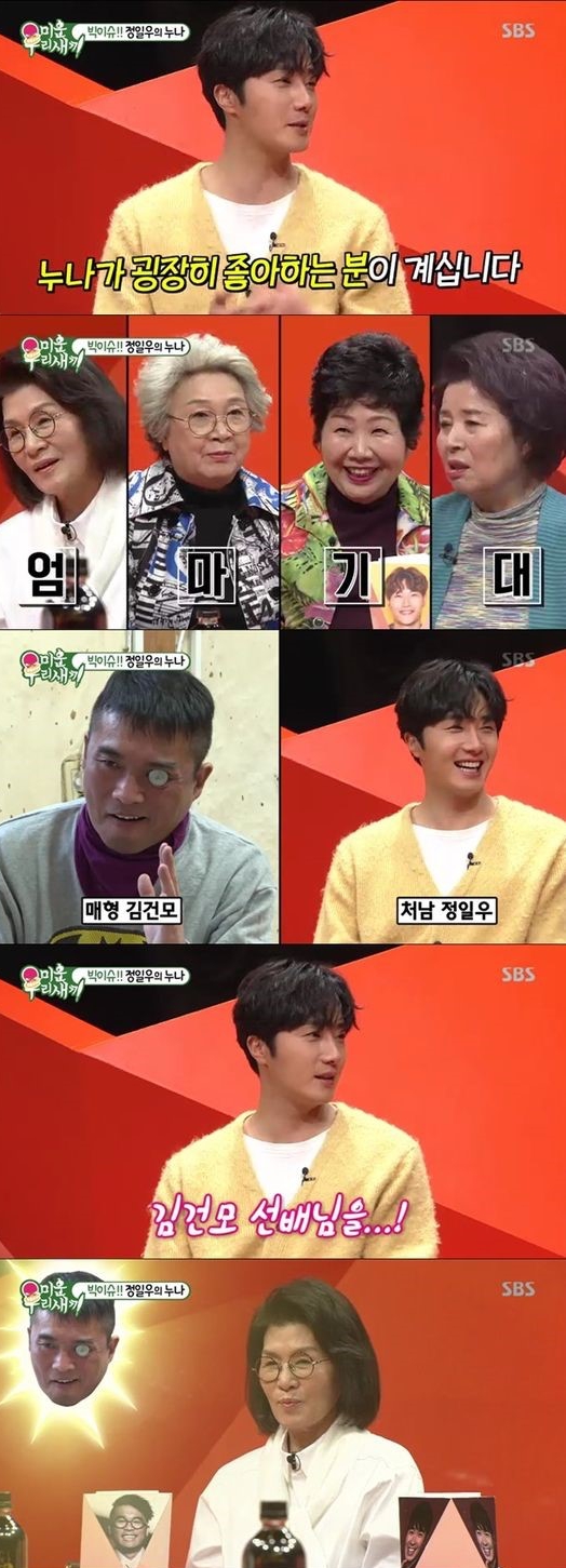 서장훈은 정일우에게 38살 싱글 누나가 있다고 말했고, 정일우는 "어딜 가도 제 누나인 걸 다 알아볼 정도로 닮았다. 패션 디자인을 전공하고 10년 정도 외국에서 공부를 하다가 왔다. 자기 샵도 운영했었다"고 말해 '미우새' 어머니들을 반색시켰다. 이어 정일우는 "누나가 '미우새' 형들 중에 좋아하는 분이 계신다. 김건모 선배님을 굉장히 좋아한다"며 "누나가 TV를 보다가 '김건모랑 결혼하는 사람은 평생 안 심심하겠다'고 하더라"며 김건모를 향한 친누나의 호감도를 전했다.