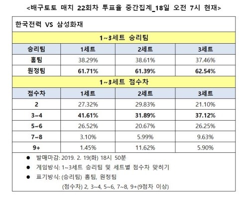 2018-2019시즌 V리그 대상 배구토토 매치 22회차 중간집계 결과