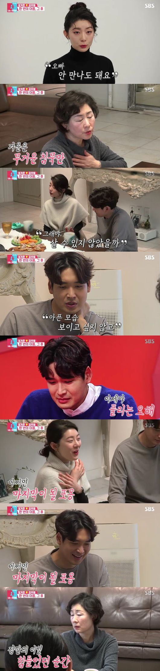 장모는 첫 인사때 무거운 침묵만 유지했던 이유를 물었다. 아내 우림은 "내가 힘든걸 스스로 알지만, 본인이 힘든걸 모르는 사람"이라면서 "그래야 오빠가 살수 있지 않았을까 생각했다"고 했다. 이에 정겨운은 눈물을 쏟으며 "아픈 모습, 힘든 모습 보이고 싶지 않고 울고 싶지 않았던 생각이 많았다"며 이제야 오해가 풀린 듯, 눈물을 멈추지 못했다. 그동안 꾹꾹 눌러왔던 진심을 쏟은 순간이었다.