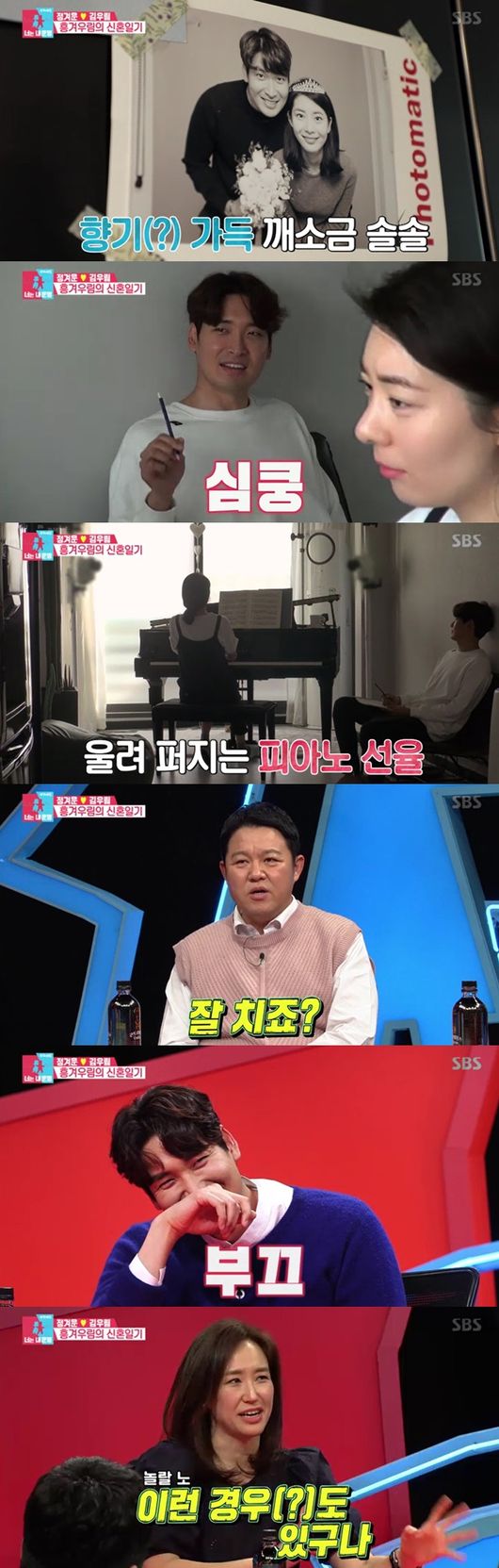 다음날 두 사람의 애정가득한 신혼부부 일기가 그려졌다. 아침부터 화음을 맞춰 노래를 부른 두 사람은 함께 김치볶음밥을 만들어 먹었다. 요리하면서도 애정표현이 계속됐다. 게다가 식성까지 천생연분인 껌딱지 부부 모습이었다. 피아노만 22년 째 친 아내는 화려한 손놀림으로 연주했다. 아내가 연습할 때도 옆에서 남편이 찰떡같이 붙어있었다. 피아노 소리 좋다는 아내에게 정겨운은 "오빠가 사줘찌이"라며 혀짧은 목소리로 애교, 또한 음악과 함께 노래는 물론 댄스 삼매경에 빠지며 아이돌 군무도 완성, 당 한도초과의 행복한 신혼부부 모습이 부러움을 자아냈다.