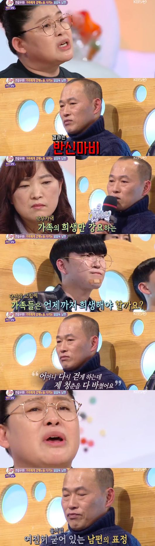 일할 때마다 힘이 생긴다는 남편은 출연진들이 “아내는 무슨 죄냐?”고 묻자, “팔자라고 생각해야 한다”라고 말해 분노를 자아냈다. 또한 일주일에 한번이라도 쉴 생각이 전혀 없다고 답했다.