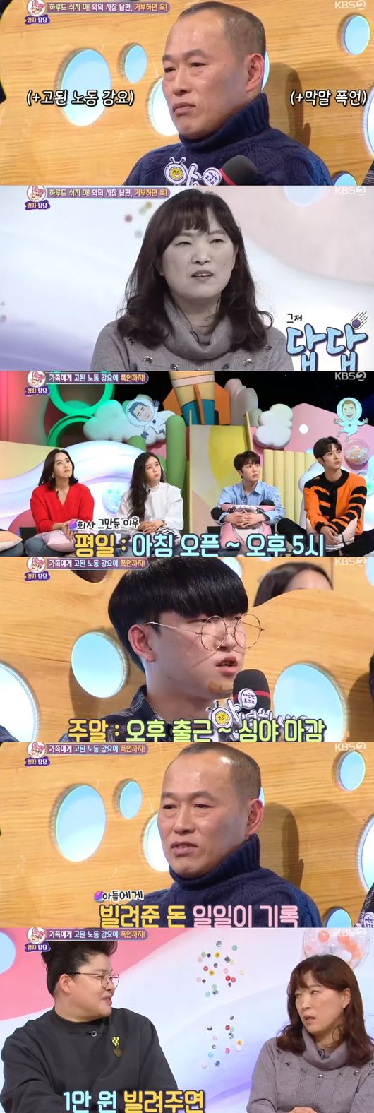 아들이 출연했다. 아들은 "거의 못 쉬고 일주일 내내 일을 한다. 하루 10시간 일해서 2만원을 받는다. 매달 총액은 고작 20만원"이라고 답했다. 아내는 "남편이 아들의 휴대전화 요금 등 메모해 두고 나중에 이자를 붙여서 회수를 한다. 그런걸 다 계산해서 차감해서 월급을 주니까 그 정도만 준다"고 전했다.