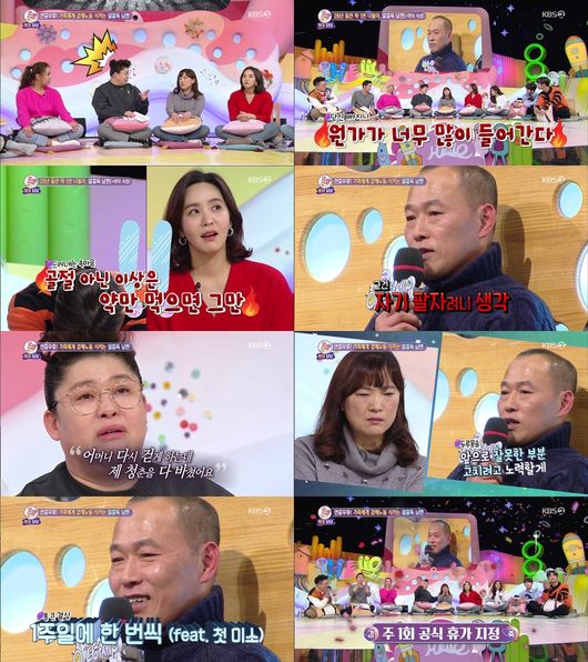하지만, 일할 때 힘이 난다는 남편의 문제는 아내나 자식들도 자신과 같아야 된다고 생각하는 것이었다. 남편은 골절상을 당하지 않는 한 가게를 나와야 된다고 했으며 자식들에게는 “무조건 열심히 해야 된다”, “죽어도 직장에서 죽어라”는 등의 말을 거침없이 한다고 했다.