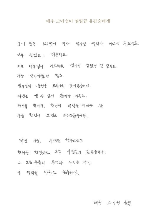 끝으로 “작년 가을, 서대문형무소에는 한마음 한뜻으로 모인 사람들이 있었습니다. 그 모든 분들의 존경과 사랑을 담아 이 영화를 바치고 싶습니다”라는 말을 전하며 작품에 함께한 많은 분들에게 존경의 마음을 표했다. 이처럼 그 어떤 가식이나 설정은 배제한 채 진심으로 유관순의 삶에 가까이 다가가려 노력했던 배우 고아성의 손편지는 보는 사람의 가슴까지 뭉클하게 해 이목을 집중시키고 있다.