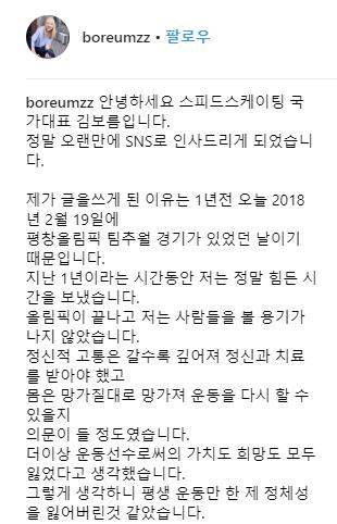 김보름은 지난 19일 자신의 SNS를 통해 "오늘은 평창올림픽 팀 추월 경기가 있었던 날"이라며 "지난 1년의 시간은 정말 힘들었다"라고 썼다.