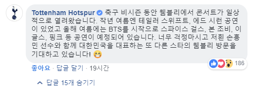 지난 20일(한국시간) 토트넘은 공식 페이스북에 방탄소년단의 6월 런던 웸블리 스타디움 공연을 축하하며 "웰컴 투 웸블리, BTS"라는 글을 게재했다.