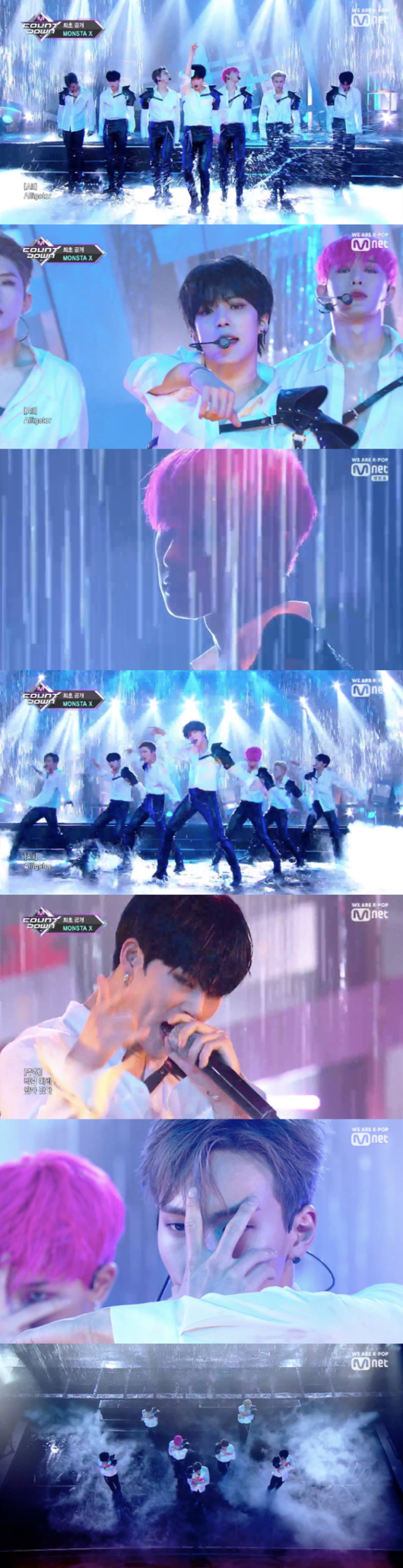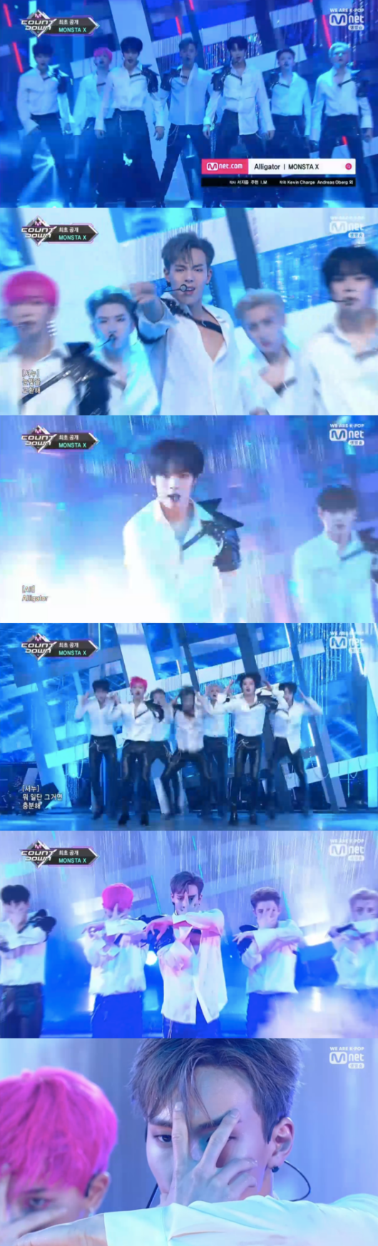 몬스타엑스는 21일 오후 방송된 케이블채널 엠넷 ‘엠카운트다운’을 통해 지난 18일 발매한 정규2집 TAKE.2 ‘위 아 히어(WE ARE HERE)’의 컴백 무대를 진행했다. 이날 타이틀곡 ‘엘리게이터(Alligator)’부터 스티브 아오키와 협업한 ‘플레이 잇 쿨(Play it Cool)’의 무대를 최초로 공개했다.