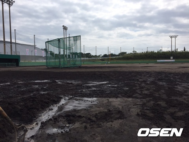 두산 베어스의 미야자키 캠프 첫 실전 경기가 비로 인해서 불발됐다.