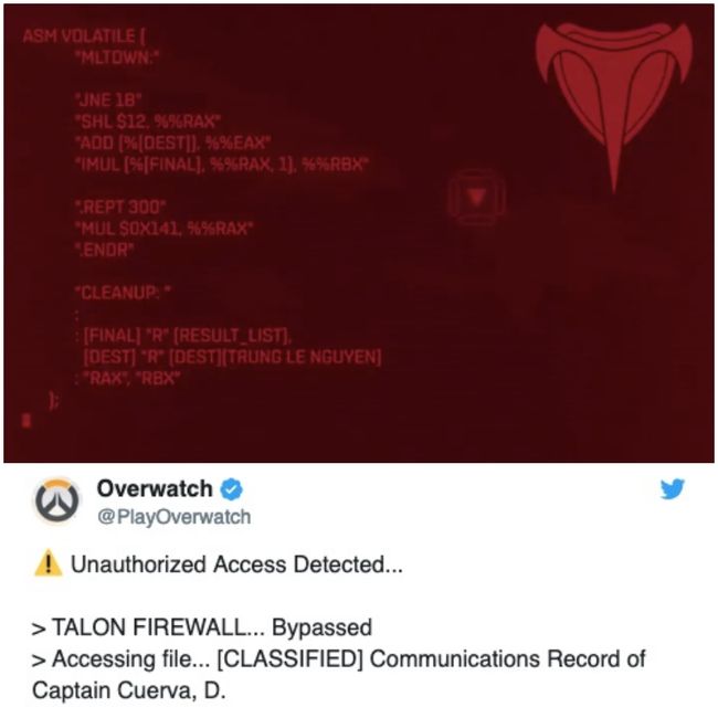 22일(한국시간) IT/게임 매체 ‘PC게이머’는 블리자드가 오버워치 트위터에 6초 가량의 짧은 티저 영상을 남겼다고 보도했다. 영상과 함께 올라온 게시글엔 ’승인되지 않는 접근이 감지됐다’, ‘탈론 방화벽이 우회됐다’는 내용이 담겼다. 영상을 재생하면 붉은 배경에 과거 ‘솜브라 떡밥’에 쓰였던 암호와 비슷한 문구를 확인할 수 있다.