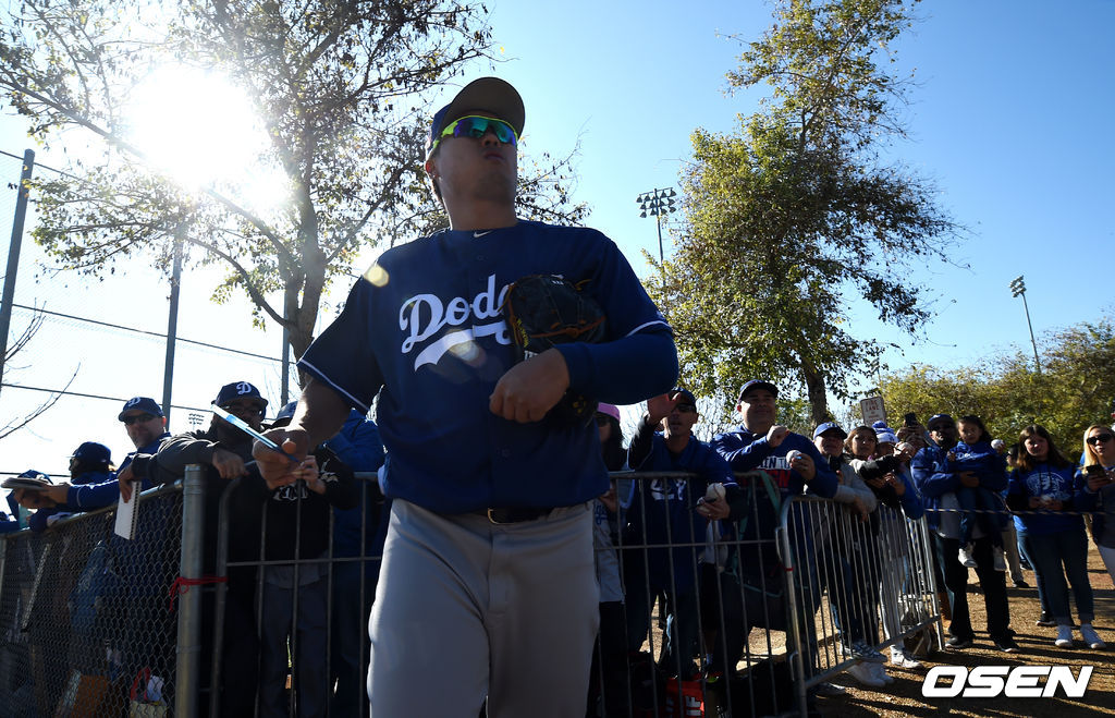 LA 다저스 류현진이 24일(이하 한국시간) 미국 애리조나주 글랜데일의 캐멀백랜치에서 열린 팀의 스프링캠프에서 훈련을 마치고 라커룸으로 향하며 팬들에 사인을 해주고 있다.