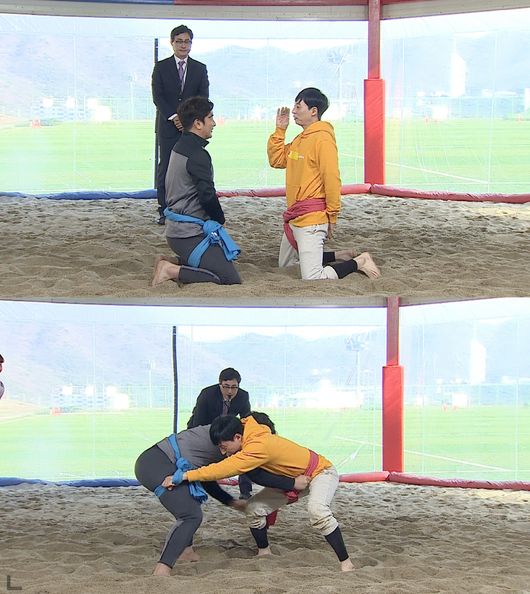 여자 씨름 선수단을 만난 만큼, 씨름으로 유치한 싸움의 결판을 내기로 했다. 씨름단과의 회식비 사비 결제를 걸고 씨름 경기를 하게 된 것. 본격 대결에 앞서, 안정환은 “네가 언제까지 국민 MC일 것 같냐?”며 유재석을 도발했고, 이에 유재석은 “너 카드한도 얼마냐? 그 끝을 보여주겠다”고 입씨름을 이어갔다. 실제 경기에 들어가자 팽팽하게 맞서며 멋진 경기를 펼쳤다는 후문이다.