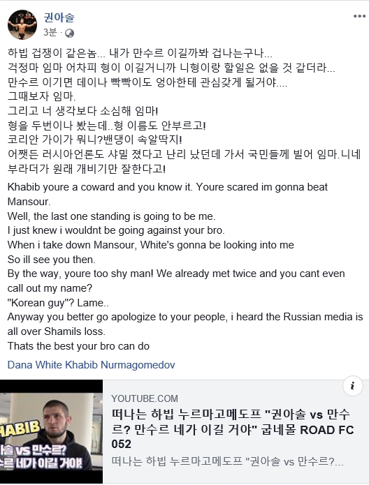 23일 경기가 하루 지난 24일 권아솔은 자신의 SNS에 “하빕 겁쟁이 같은 놈. 내가 만수르 이길까봐 겁나는 구나. 걱정마 임마. 어차피 형이 이길 거니까. 니 형이랑 할 일은 없을 것 같더라”라는 내용의 글을 올리며 또 다시 도발을 이어갔다.