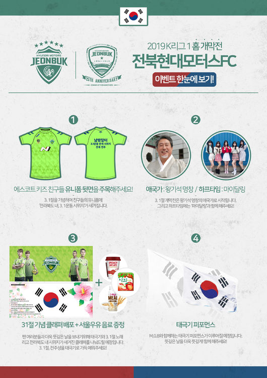 3월 1일 개막전을 치르는 전북현대는 3.1 운동 100주년과 개막전을 기념해 다양한 행사를 준비했다.