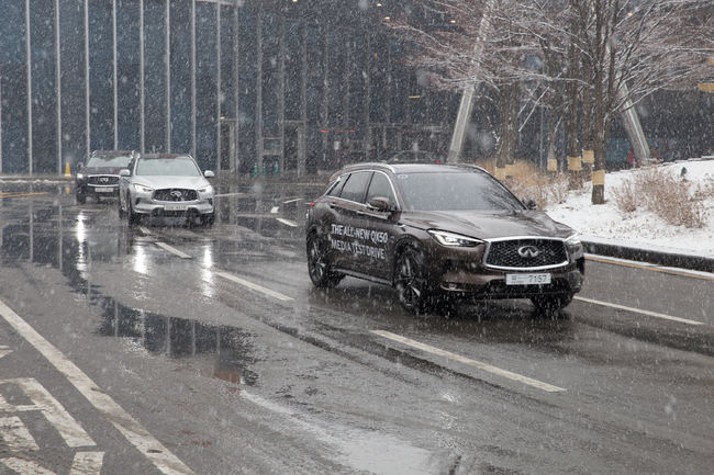 인피니티가 자랑하는 인텔리전트 사륜구동 시스템(AWD)은 눈길 속에서도 시승행사를 강행할 수 있었던 자신감 정도로 이해하면 될 듯했다. AWD 드라이브 트레인은 지속적으로 구동력과 휠 스핀을 모니터링하고, 구동력의 최대 50퍼센트를 후륜에 분배할 수 있다. 후륜의 구동이 필요하지 않은 경우에는 드라이브 트레인이 전륜 구동으로 전환 돼 효율을 극대화 한다. 정지 상태에서 가속할 때는 시스템이 파워를 전달하는 AWD 구동으로 자동 전환해 구동력을 전후륜에 50:50으로 배분한다.