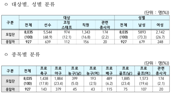 한편 이번 조사는 지난해 5월부터 12월까지 한국여성정책연구원이 온라인과 모바일을 통한 비대면·무기명 전수조사 행태로 실시됐다. 조사 대상은 5개 종목, 7개 프로연맹(한국프로축구연맹, 한국야구위원회, 한국농구연맹, 한국여자농구연맹, 한국배구연맹, 한국프로골프협회, 한국여자프로골프협회) 소속 선수, 코칭스태프, 직원 전원과 관련 종사자(치어리더, 체육기자) 등 총 8035명이었다. 응답자는 927명으로 응답률은 11.5%였다. /letmeout@osen.co.kr