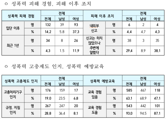 유형별로는 입단(종사) 이후 ▲ 언어적·시각적·기타 성희롱은 12.7%(여성 응답자 중33.0%, 남성 응답자 중 5.1%), ▲ 육체적 성희롱은 4.3%(여성 응답자 중 12.9%, 남성 응답자 중 1.0%), ▲ 온라인 성범죄는 1.1%(여성 응답자 중 4.0%, 남성 응답자 중 0%)인 것으로 조사되었다.(중복 응답 가능)