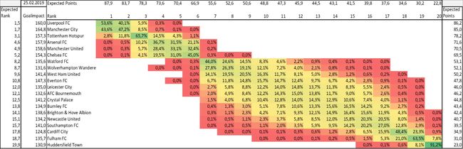 이 업체는 자체 알고리즘을 통해 분석한 결과 리버풀의 우승확률을 53.6%로 예측, 43.6%인 맨시티보다 높게 나타났다고 설명했다. 또한 유럽축구연맹(UEFA) 챔피언스리그(UCL) 진출권이 걸린 4위 싸움은 아스날이 최종 승자가 될 것으로 봤다.