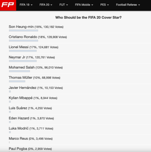 피파게임 관련 소식과 유저들의 의견을 반영하고 있는 사이트인 FIFPlay에서는 지난해부터 올해 출시될 '피파 20' 커버모델을 묻는 설문조사를 하고 있다.