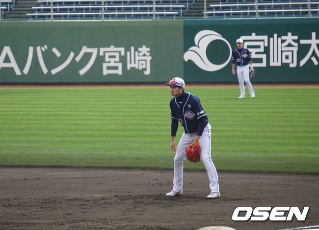 정진호는 28일 일본 미야자키 선마린구장에서 열린 '미야자키 구춘 베이스볼 게임즈'에 7회말 교체 출장했다. 그러나 이날 정진호는 평소 나서던 외야 포지션이 아닌 1루수 자리에 위치했다. 수비 포지션과 상관없이 타석에 실전 감각을 점검하기 위함이었다.