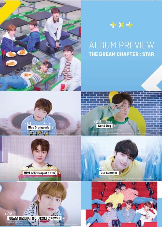 오는 4일 드디어 데뷔의 꿈을 이루는 투모로우바이투게더의 데뷔 앨범은 ‘꿈의 장: STAR’로 신인 그룹 특유의 청량미와 소년미가 가득 담겼다. 이날 공개된 앨범 프리뷰 영상에는 타이틀곡 ‘어느날 머리에서 뿔이 자랐다 (CROWN)’를 포함해 총 5개 트랙의 음원 하이라이트와 뮤직비디오의 일부 장면이 함께 담겼다.