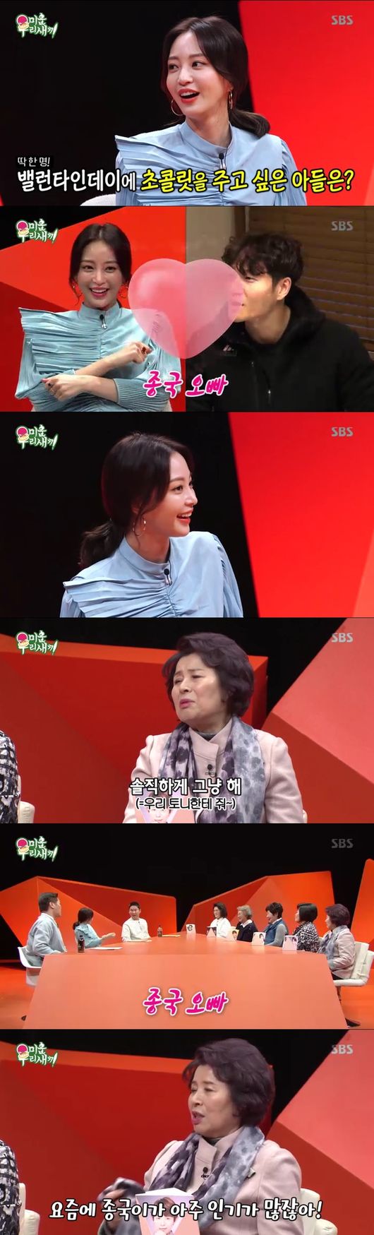 한편, 워낙 솔직한 성격이란 한예슬은 "거짓말 못한다, 항상 들통난다"고 말했다. 그런 한예슬에게 발렌타인 데이 때 초콜릿 주고 싶은 아들 딱 한명만 고르라고 하자, 한예슬은 "김종국, 친분이 워낙 있다"며 친한친구끼리 친구라고 해 눈길을 끌었다. 母들은 "요즘 종국이가 인기가 많다"며 부러워했고, 홍진영母는 갑자기 물을 들이키며 견제하는 모습이 재미를 더했다. /ssu0818@osen.co.kr