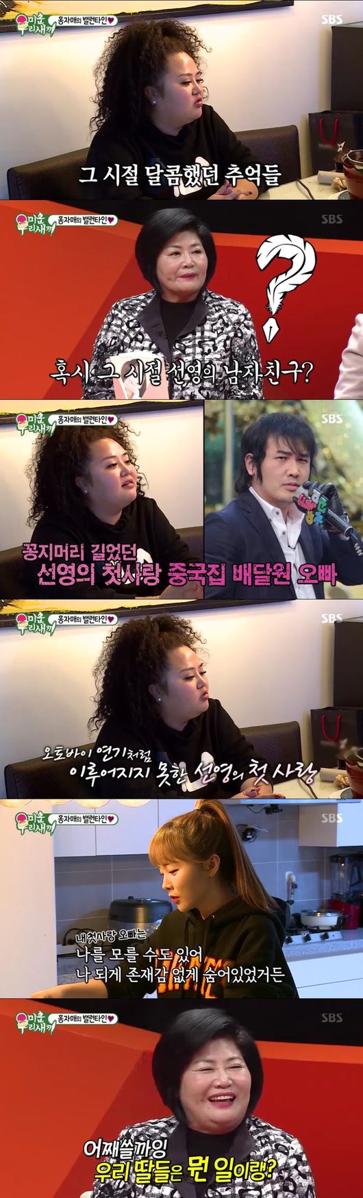 두 사람은 어릴 적 첫사랑을 떠올렸다. 특히 홍선영은 중국집 배달 오빠가 첫사랑이었다고 사탕으로 만든 초콜릿 하트에 종이학까지 접었다고 했다. 母는 처음듣는 얘기에 솔깃 "그래서 그집에서만 계속 시켰구나"라고 회상했다. 홍진영은 누구 닮았는지 궁금, 홍선영은 "김보성 닮은 배달원오빠"라고 말해 흥미로움을 안겼다. 홍선영은 "그 사람도 내가 좋아하는지 알았다, 내가 지나가면 오토바이 곡예를 했다"고 말해 웃음을 안겼다.