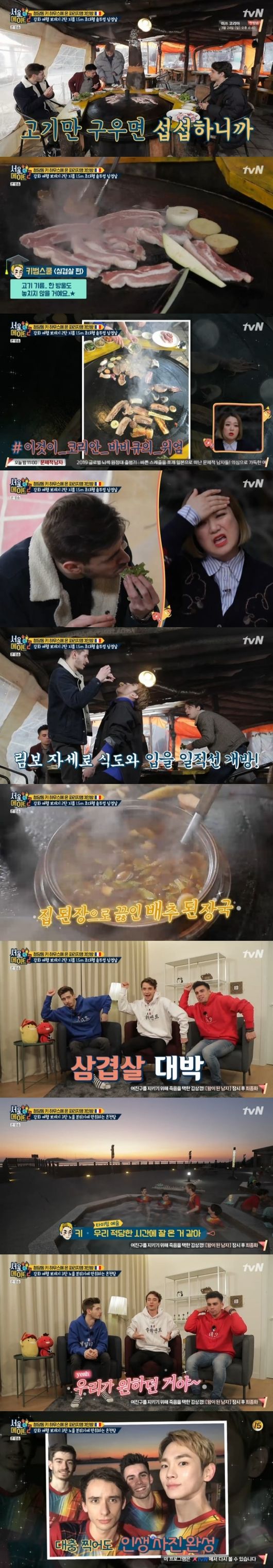 이어 뚝배기 그릇에 집 된장으로 끓인 된장찌개가 나왔고, 새하얀 쌀밥이 추가됐다. 테오는 "한국에서 먹은 것 중에 최고다. 5시간 동안 먹을 수 있을 것 같다"고 했고, 키는 "그럴 줄 알았다"며 뿌듯해했다. 프랑스 3인방은 "삼겹살 대박"이라고 외쳤다.