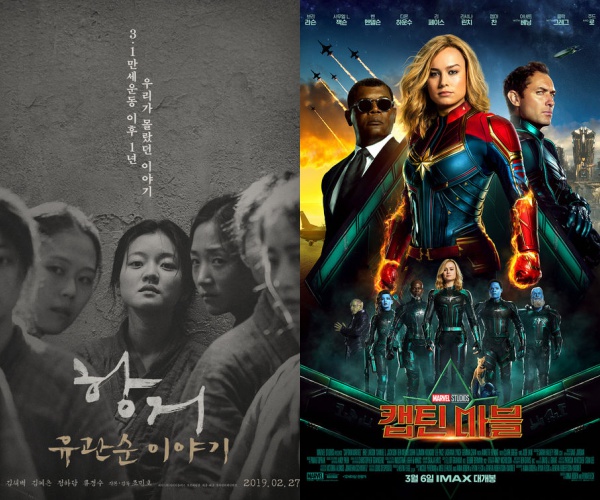 ‘항거’가 5일째 1위를 이어가고 있는 가운데 오늘(6일) 개봉되는 ‘캡틴 마블’이 스크린을 휩쓸 것으로 예상된다.